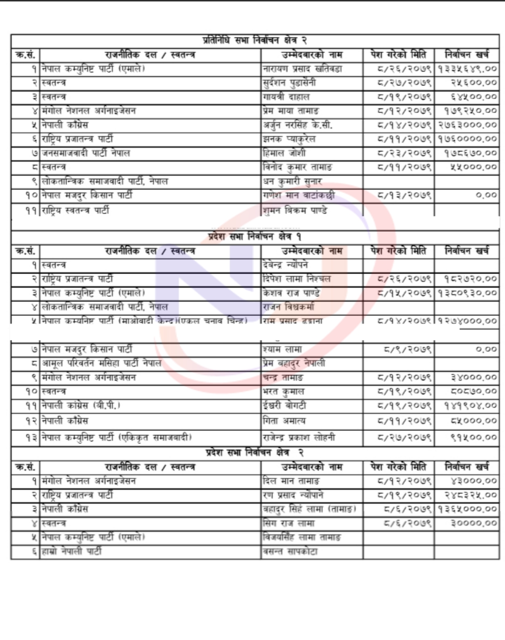 निर्वाचन मत परिणाम घोषणा हुनुभन्दा अगावै मङ्सिर ६ गते नुवाकोट क्षेत्र नम्बर २ (२) का प्रदेशसभा सदस्यका उम्मेदवारद्वय नेपाली काँग्रेसका बहादुरसिं लामा र स्वतन्त्र उम्मेदवार सिहंराज लामाले आफ्नो चुनावी खर्च विवरण बुझाएका थिए ।