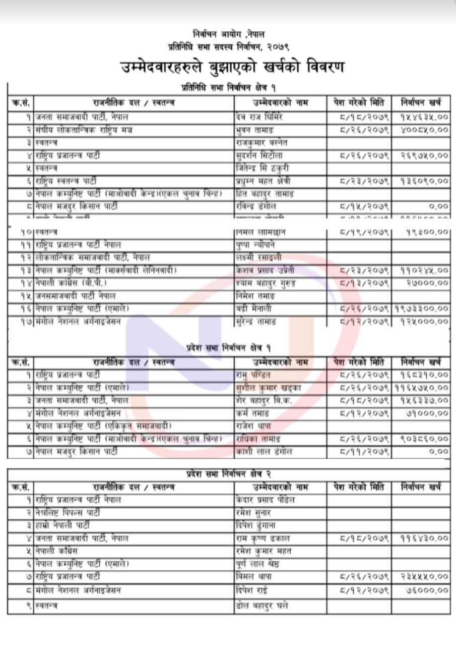 जिल्लामा निर्वाचन आयोगले खर्च विवरण पेश गर्न निर्देशन दिएसँगै उम्मेदवारले खर्च विवरण जिल्ला निर्वाचन कार्यालय नुवाकोटमा बुझाउन थालेका छन्। ६३ उम्मेदवार रहेको नुवाकोटमा ४२ जनाले निर्वाचन खर्च विवरण बुझाएका छन् ।